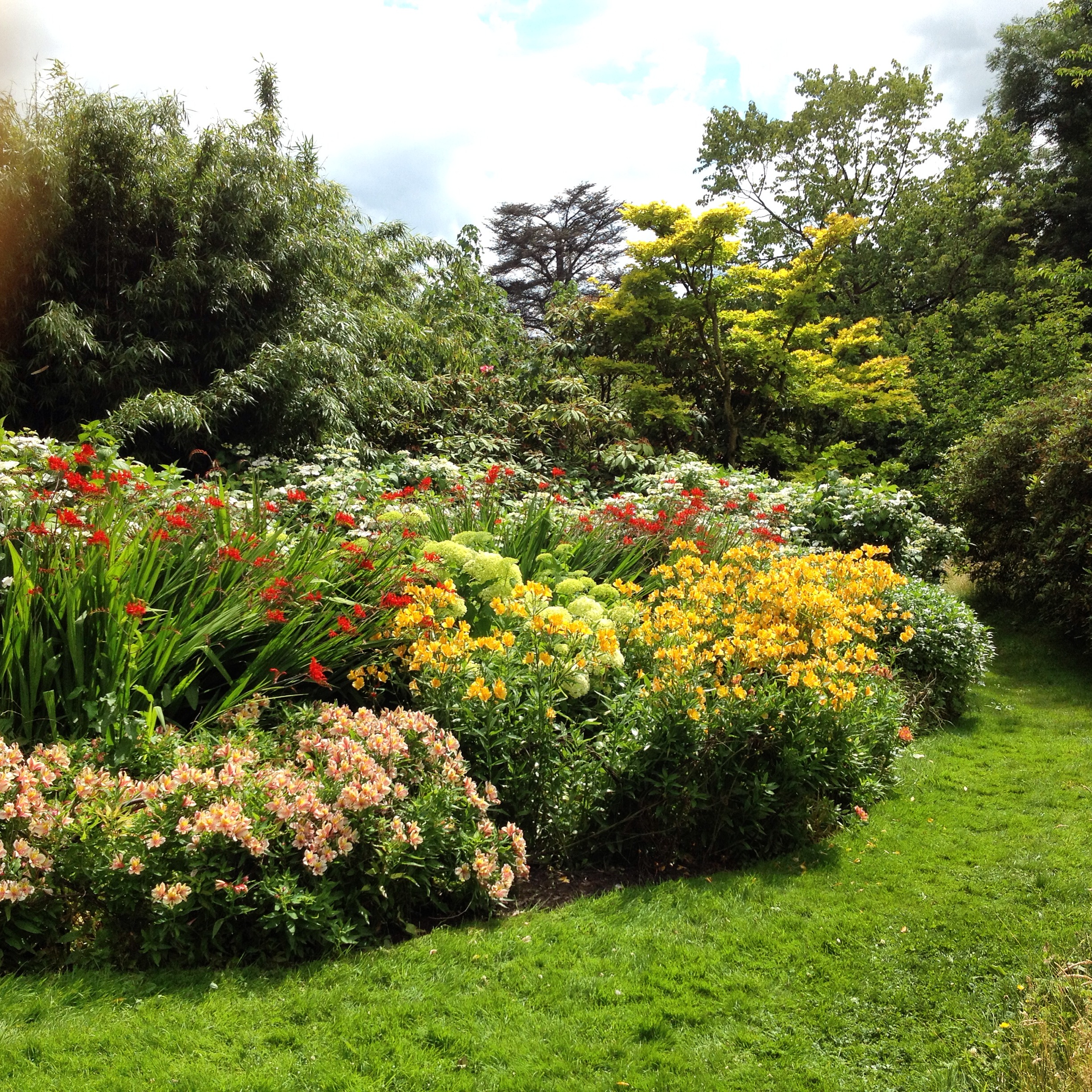 An interesting selection of shrubs can be found here including a fine Clerodendron trichotomum, Deutzia, Kolkwitzia, Camellia, and the Roses ‘Mutabilis’ with its abundance of multi-toned flowers and red stems, and the large white flowers of R. ‘Sally Holmes’. All the borders here have something of interest at all times of the year from early spring bulbs to the autumn tints.