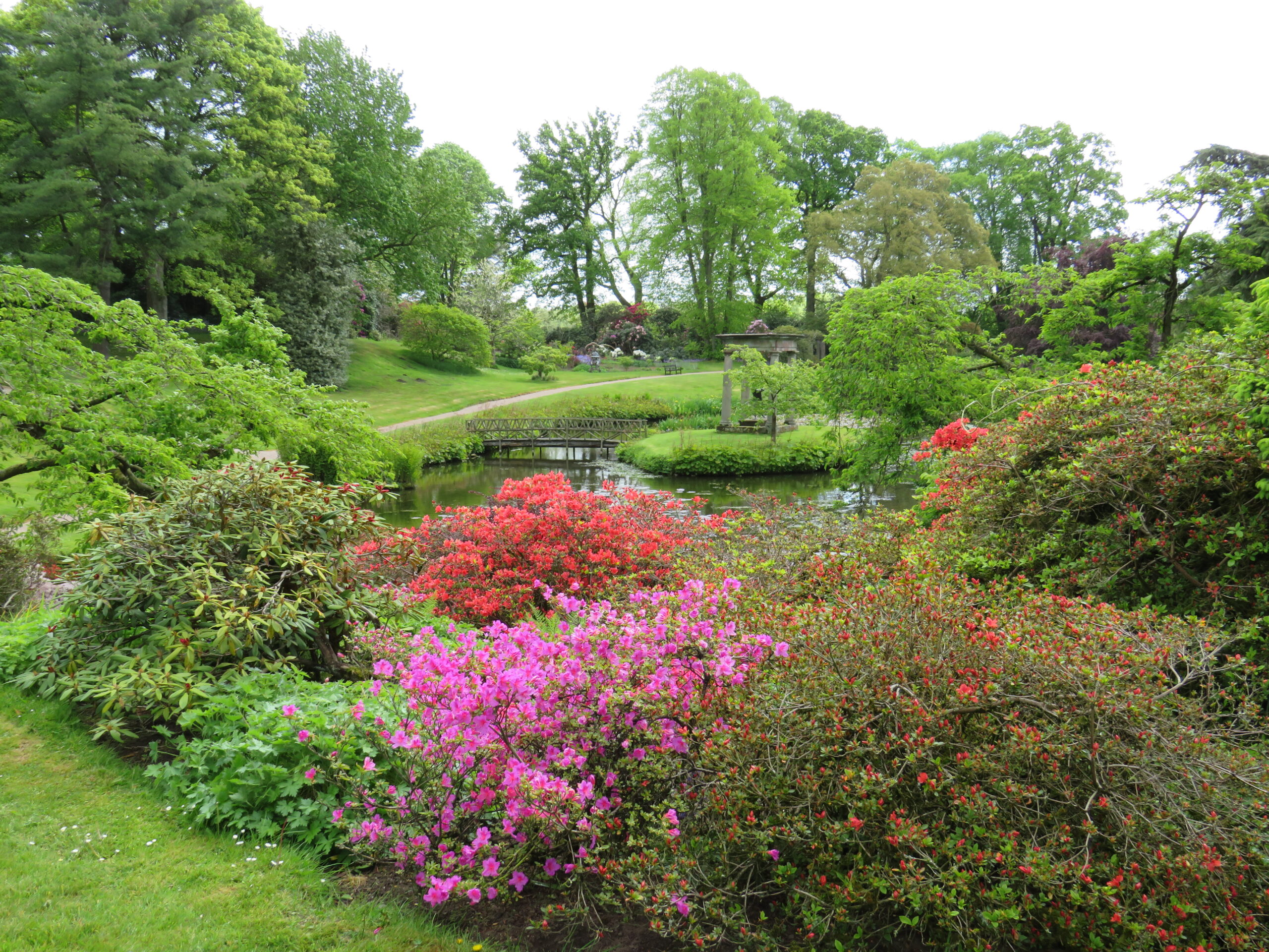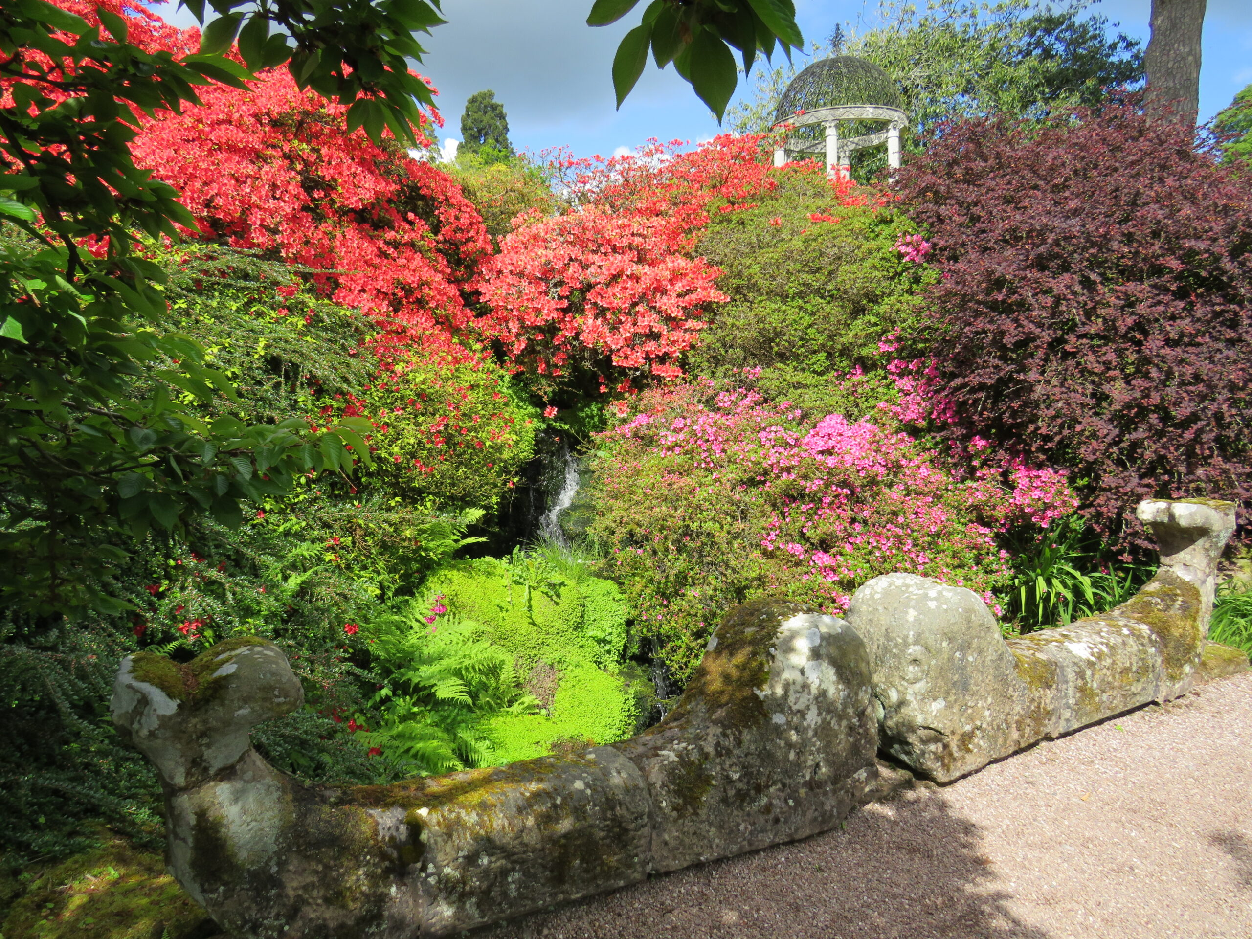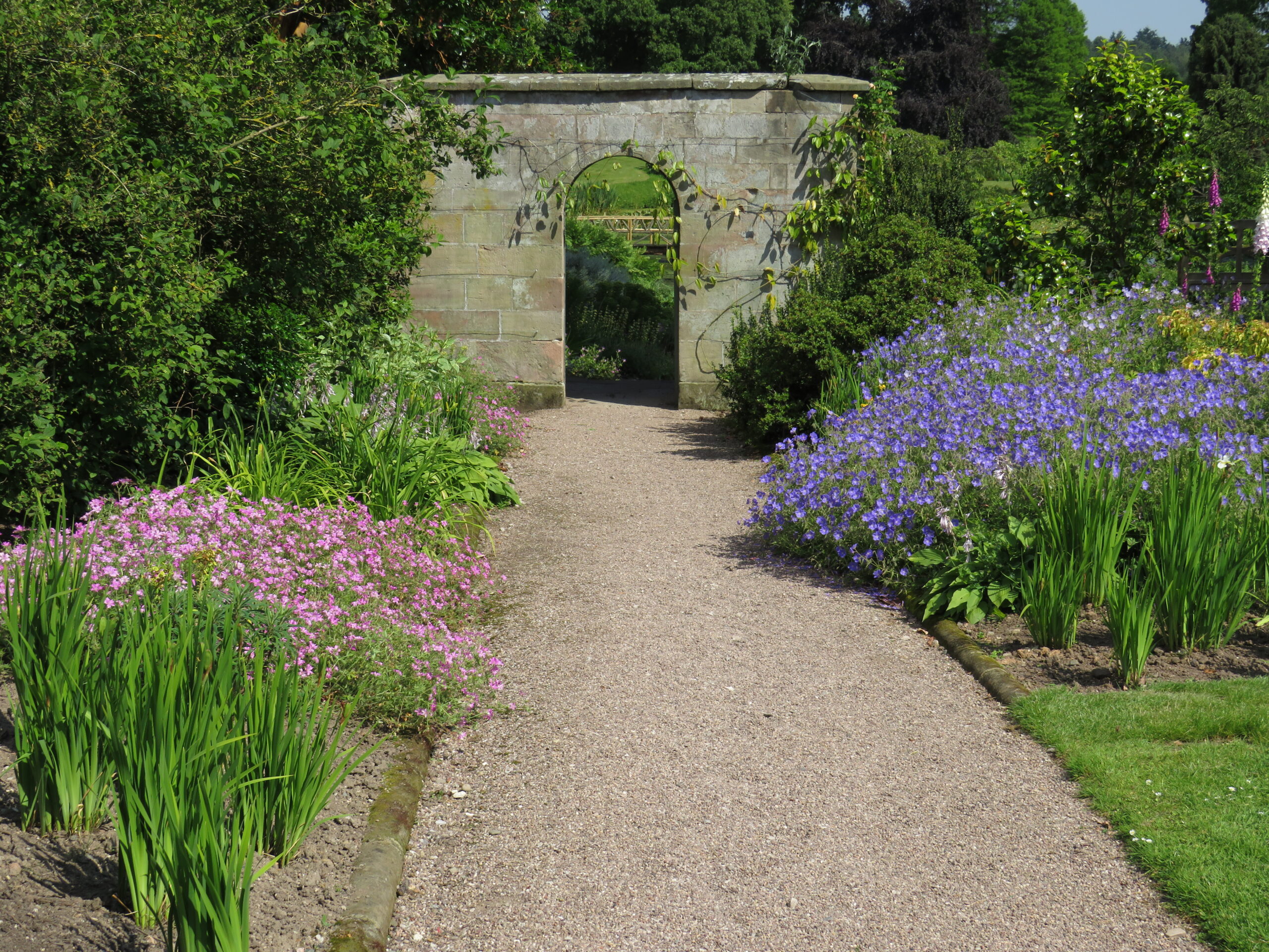 Entering through the stone gatehouse, the area on the left contains many interesting shrubs and is looked over by Eucalyptus gunnii (Cider Gum), and Arbutus xAndrachnoides, both with fabulous bark. Here a small flight of steps leads you up to a fine Persian ironwood, interesting at any time of year, and a group of the violet blue flowering Buddleja ‘Loch Inch’ next to a small gate. This gate was beautifully wrought by Tijou for the 1st Earl of Cholmondeley in around 1715, and bears the family coat of arms and motto Cassis Tutissima Virtus, (virtue is the safest helmet). The gate and many other features of this garden including the temple on the island and much of the sandstone from which the rockery was formed were all transported from the old hall. Indeed some of the sandstone must have been part of the stonework of the old house itself, as it is possible to trace the carving on what must have been sections of a capital.