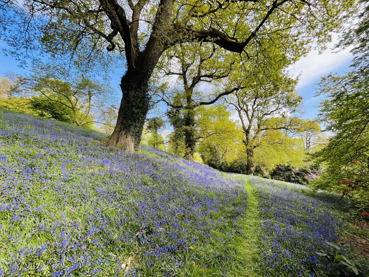 If you follow the pathways straight up you are led out onto a marvellous panorama of the surrounding countryside, by which there is a truly splendid old Spanish chestnut. In late spring the lower slopes behind the Cafe are clothed in huge populations of English Bluebells which are a joy to behold.