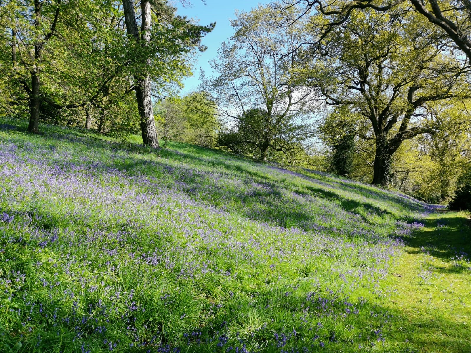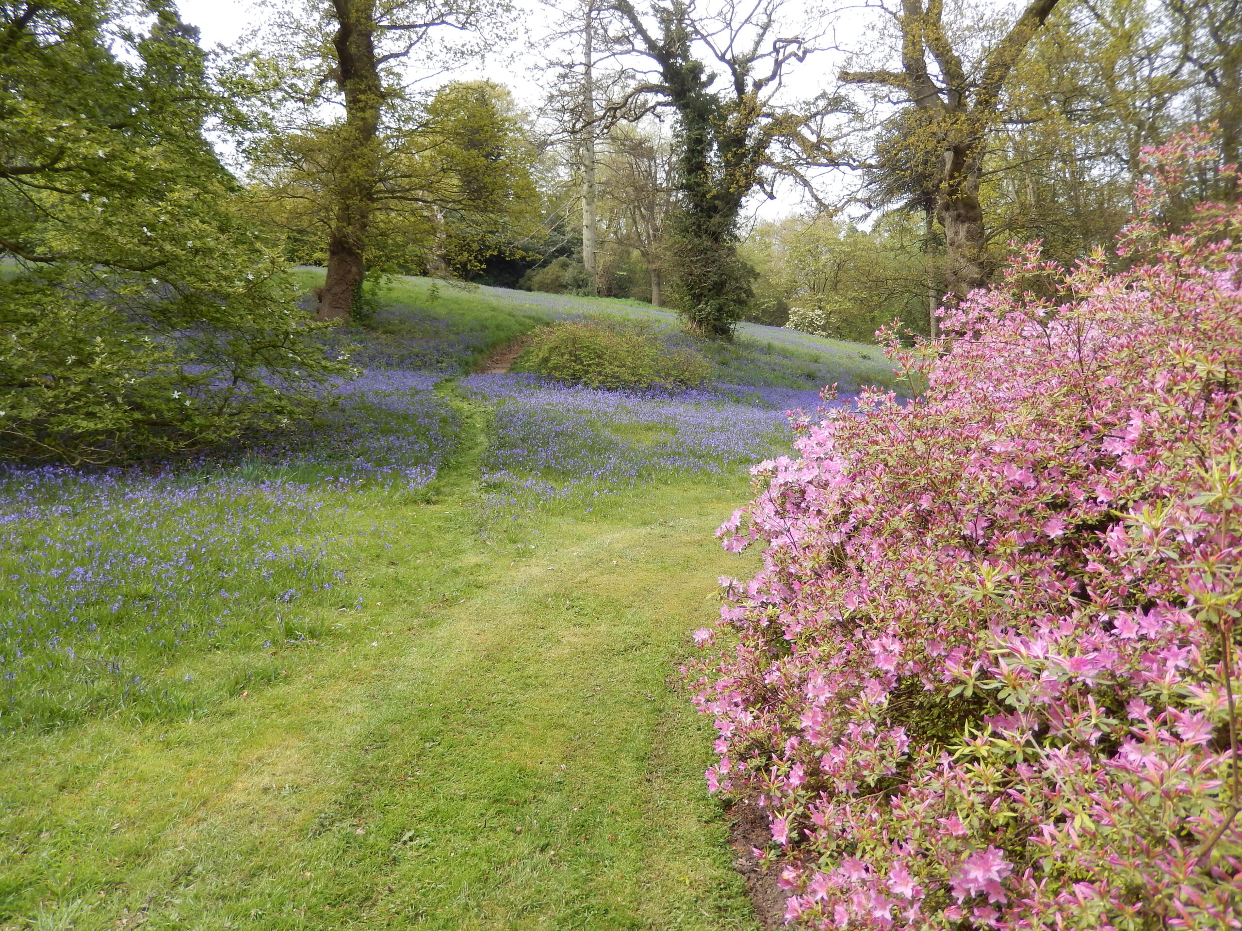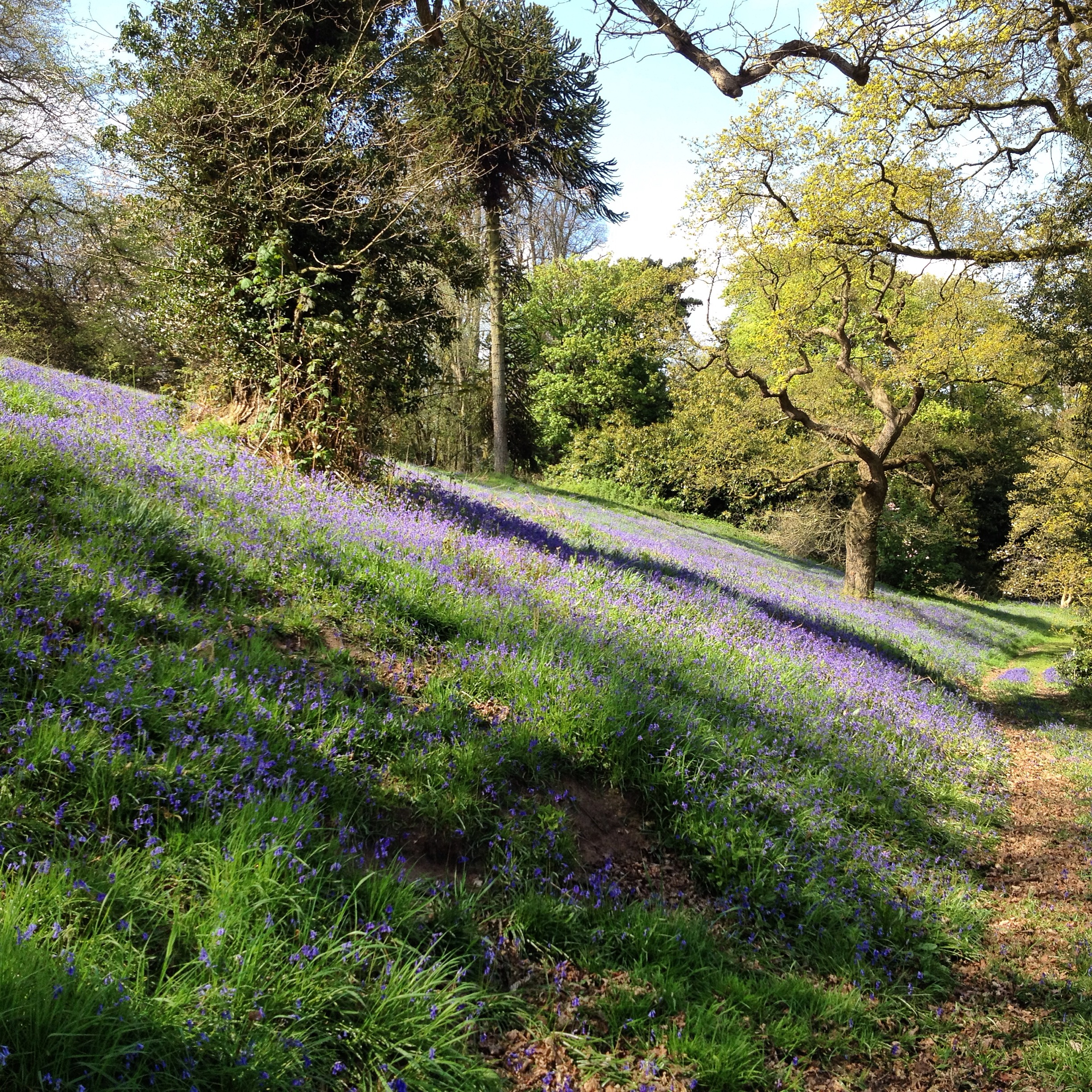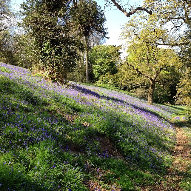 If you follow the pathways straight up you are led out onto a marvellous panorama of the surrounding countryside, by which there is a truly splendid old Spanish chestnut. In late spring the lower slopes behind the Cafe are clothed in huge populations of English Bluebells which are a joy to behold.